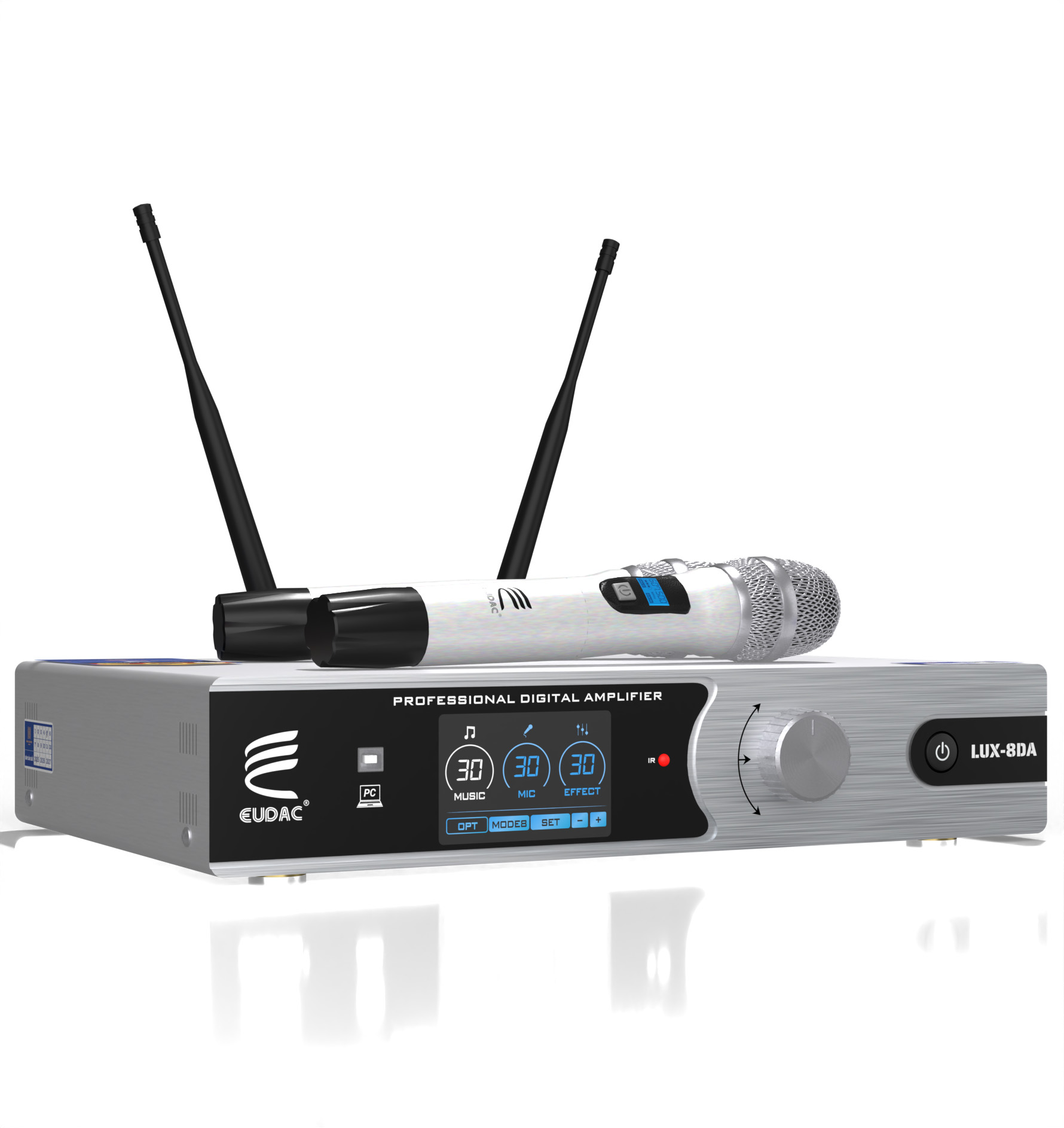 Logo EUDAC ngoài in ở mặt mặt trước góc trái còn được được khắc nổi tinh tế ở phần mặt trên amply, tạo điểm nhấn nhận diện thương hiệu đẳng cấp. Ở trung tâm mặt trước là màn hình hiện đại, bố trí gọn gàng, trực quan. Giao diện hiển thị các thông số như MUSIC, MIC, EFFECT được thiết kế theo dạng vòng tròn dễ quan sát, giúp người dùng nhanh chóng nắm bắt và điều chỉnh theo nhu cầu. Các phím cảm ứng như OPT, MODE, SET…dễ bấm với phản hồi chính xác.