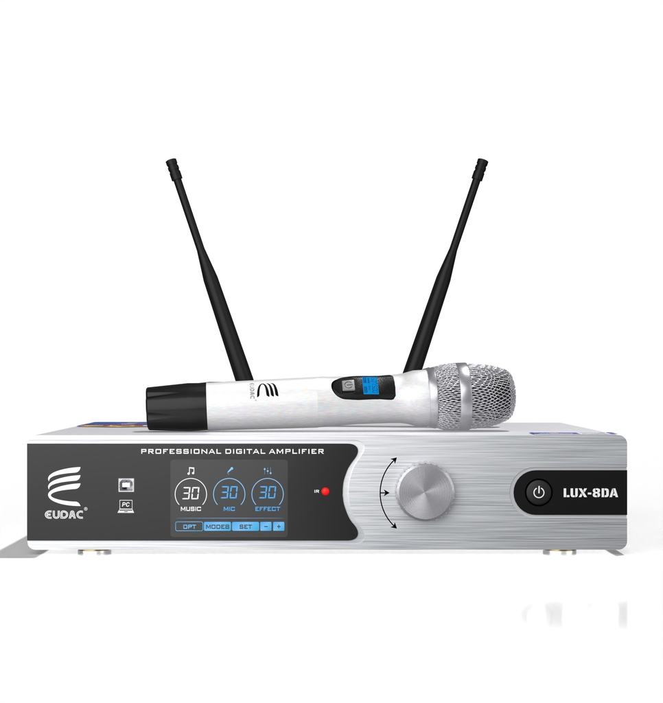 EUDAC LUX-8DA được trang bị hai micro không dây cao cấp, cùng tông màu bạc với amply tạo nên sự đồng nhất. Micro được thiết kế nhỏ gọn, thân cầm chắc tay, nút nguồn lớn giúp thao tác dễ dàng. Phần lưới micro dạng kim loại sáng bóng tạo cảm giác bền bỉ và hiện đại. Logo EUDAC in sắc nét trên thân, góp phần tạo nên sự chuyên nghiệp của toàn bộ hệ thống. Mặt sau ngoài các cổng kết nối đa dạng là ăng-ten thu sóng linh hoạt, giúp nâng cao khả năng bắt sóng và đảm bảo tín hiệu ổn định khi hát. Thiết kế gọn, dễ gấp gọn khi không sử dụng, góp phần giữ tổng thể sạch sẽ và gọn mắt.