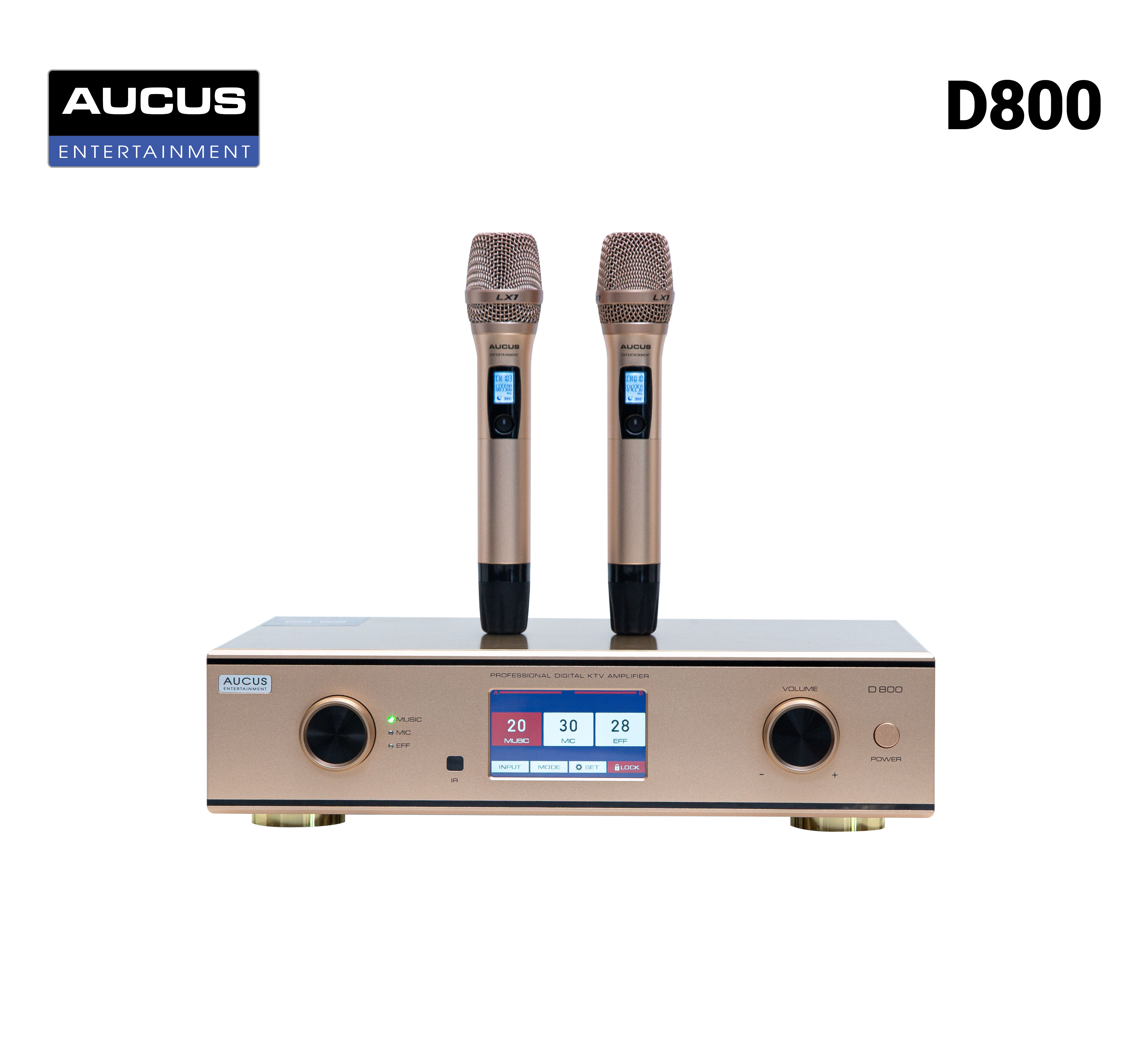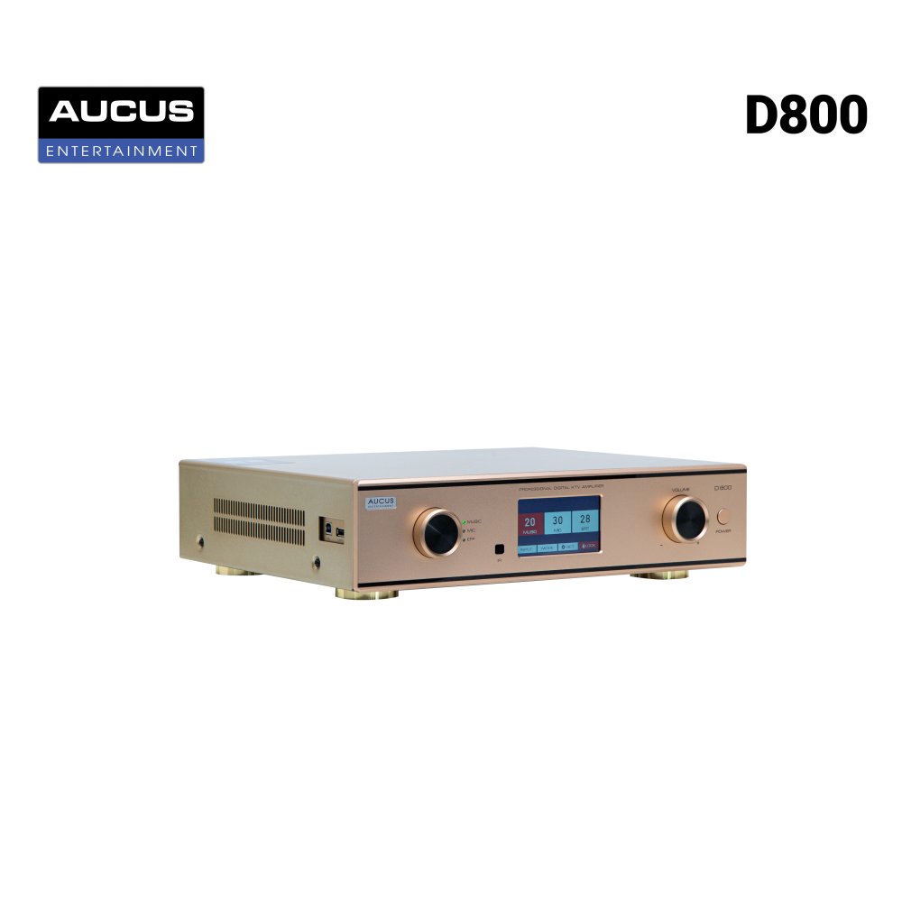 Amply thích hợp Micro Aucus D800 là dòng Amply sử dụng kỹ thuật số tích hợp 3in1 (Amply, vang số và mic không dây) D800 sở hữu thiết kế hiện đại nhỏ gọn với hai mầu chủ đạo đen, vàng đồng rất hợp thời trang. Ngoài ra nó còn sở hữu màn hình lớn hiển thị các tính năng một cách trực quan đồng thời điều chỉnh các chức năng bằng cảm ứng. Các chức năng music, mic với 7 dải tần số và effect giúp bạn dễ dàng điều chỉnh kèm với các phím trên mặt máy hoặc qua cổng USB kết nối với PC. Với công suất thực một kênh 750W tần số đáp ứng từ 50Hz-20KHz giúp bạn có một trải nghiệm âm thanh sống động. Hơn thế bạn có thể nghe nhạc MP3 thông qua cổng USB với các bản nhạc yêu thích.