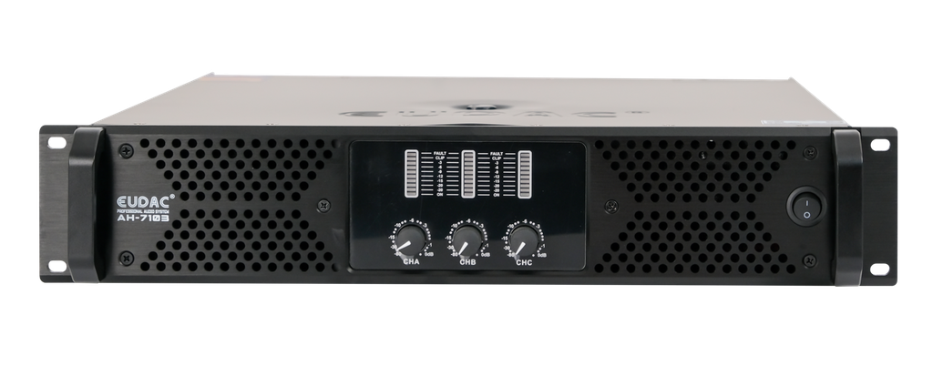 Cục đẩy công suất EUDAC AUDIO AH-7103 là dòng cục đẩy 3 kênh cho công suất lớn được ra mắt gần đây. Với công nghệ sản xuất hiện đại cùng với từng chi tiết được thiết kế tỉ mỉ mang đến cho thiết bị vẻ ngoài đẹp mắt cùng khả năng khuếch đại âm thanh chuyên nghiệp. AH-7103 chuyên dụng cho các sự kiện, sân khấu, hệ thống âm thanh chuyên nghiệp.