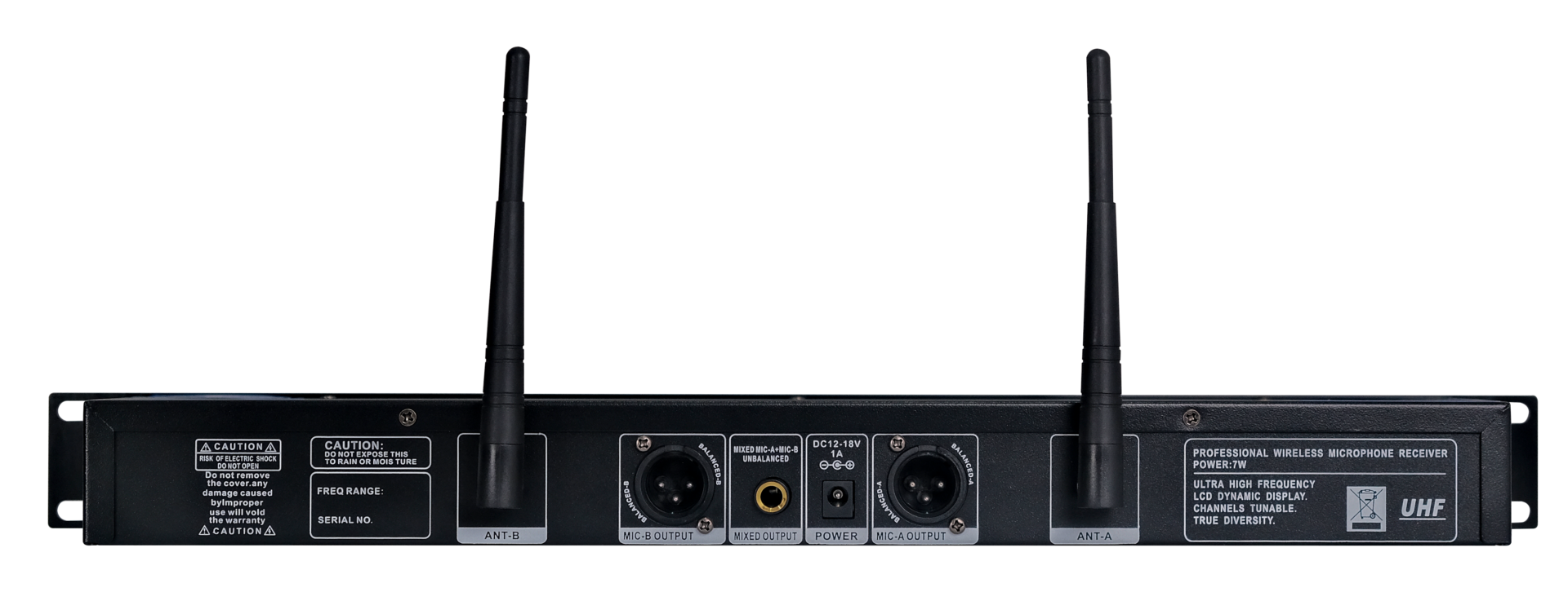 Bộ thu tín hiệu của LEQI KG-2800 được thiết kế dạng rack 1U tiêu chuẩn, thuận tiện để lắp đặt trong các tủ thiết bị âm thanh chuyên dụng. Mặt trước máy nổi bật với một màn hình hiển thị LED sắc nét, thể hiện rõ trạng thái hoạt động của cả hai kênh, bao gồm tần số, mức sóng và chỉ số tín hiệu. Hệ thống nút điều khiển bao gồm nút SET, nút điều chỉnh tần số và nút đồng bộ IR, tất cả được sắp xếp logic, dễ thao tác ngay cả trong điều kiện ánh sáng yếu.