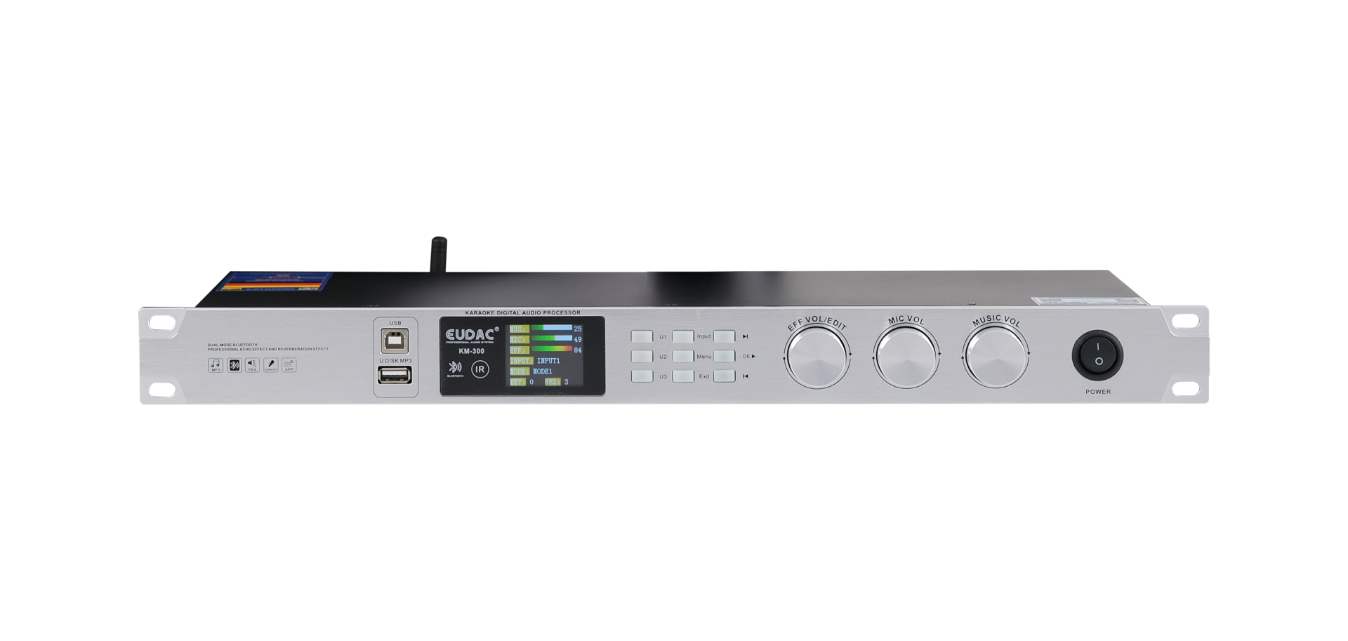 Đồng thời các cổng USB cùng cổng U disk MP3 được đặt ngay phía trước cùng với đó là các cổng đầu vào thông dụng cho đầu karaoke, TV Smart,..được bố trí ngay phía sau thuận tiện cho việc ghép nối vang số EUDAC AUDIO KM-300 với các thiết bị âm thanh khác để tạo nên một hệ thống âm thanh chất lượng.